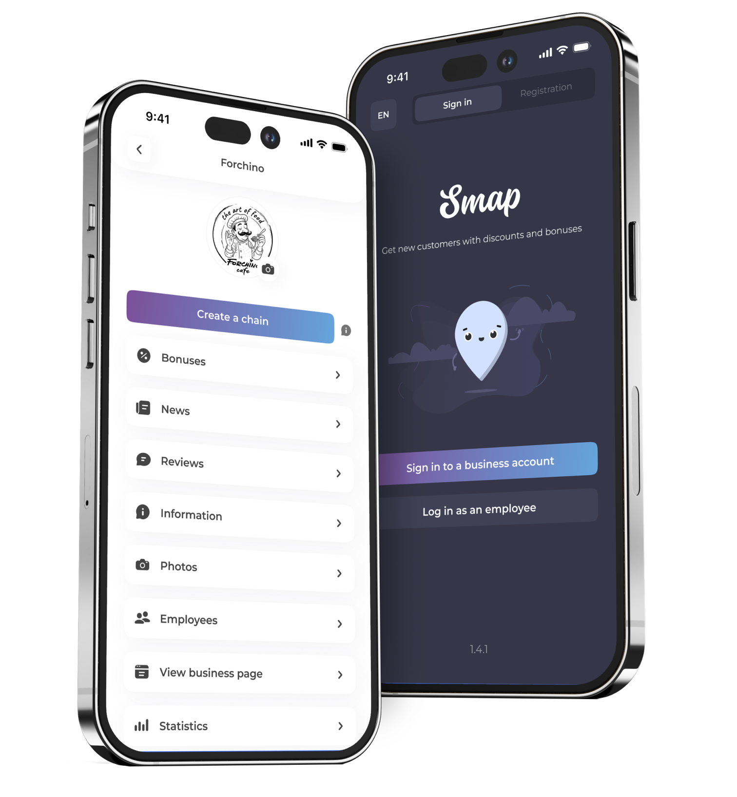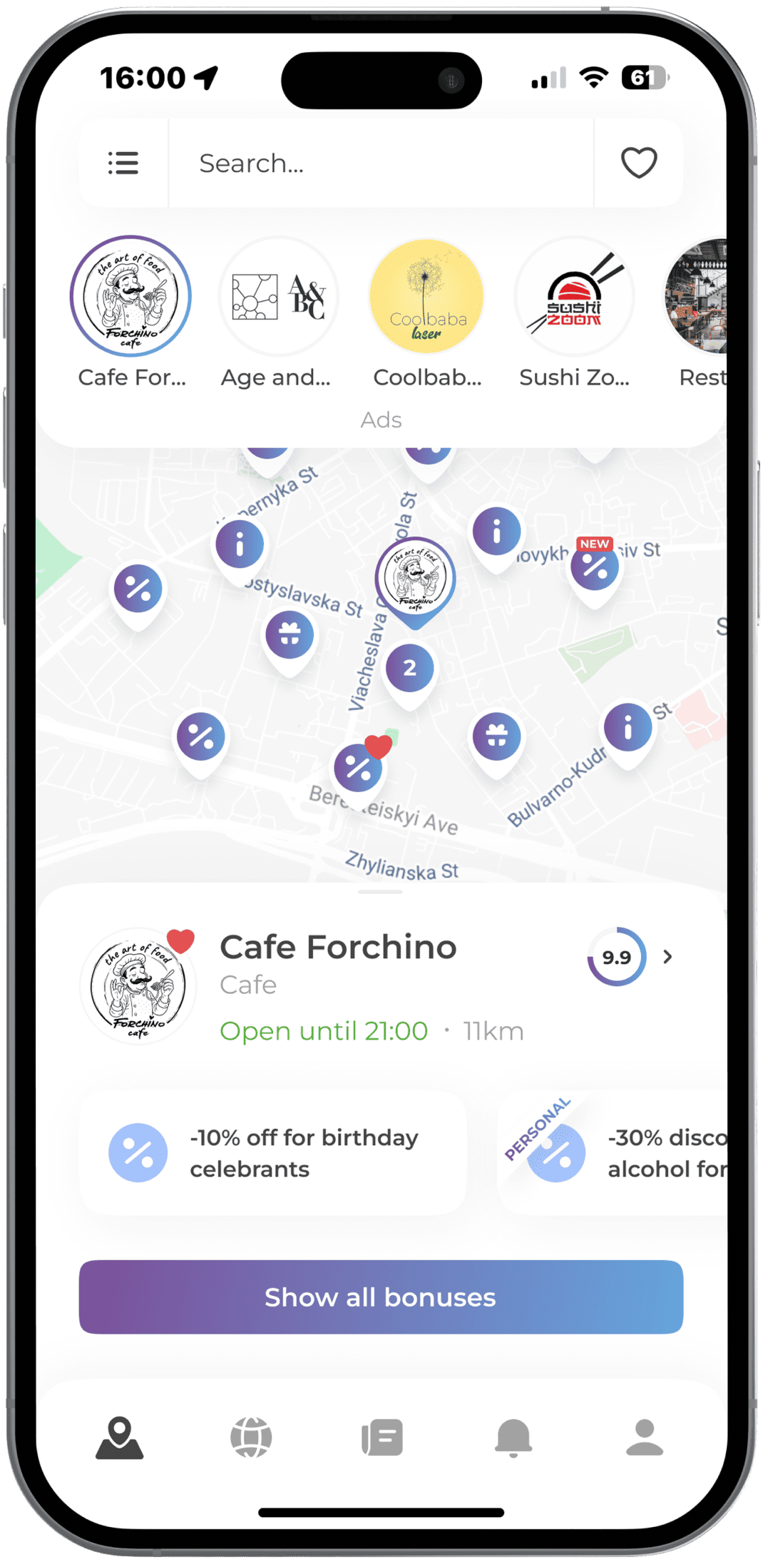 Download the application, create one or more discounts and thousands of new users will see your business. You also have a unique opportunity to accrue personal bonuses. Do you have permanent or seasonal discounts, your loyalty program? Tell us about it via Smap. Manage discounts and track statistics on your smartphone