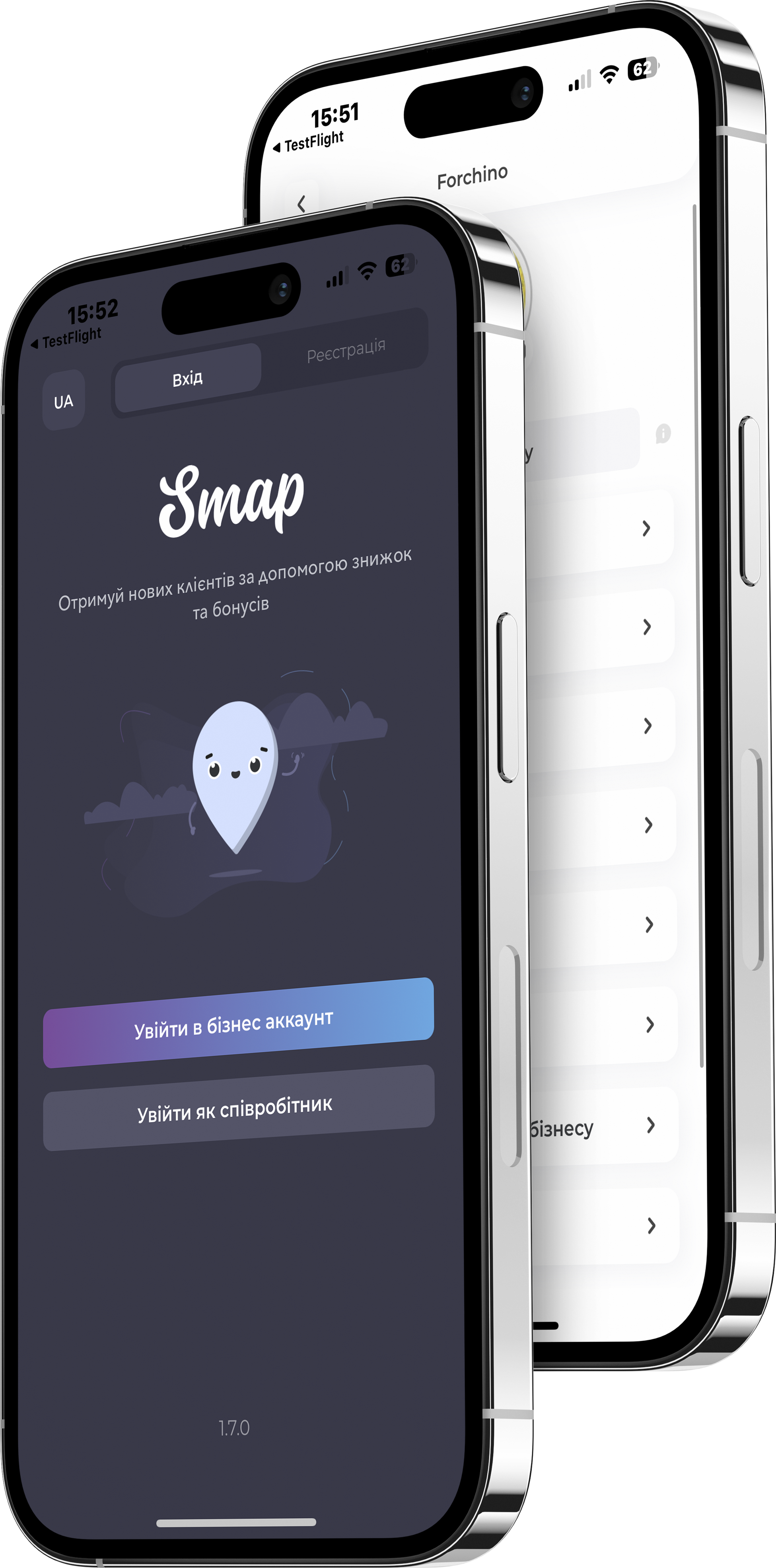 Застосунок складається з двох частин: Smap Business та Smap. Коли ви реєструєтесь у Smap Business, то профіль вашого бізнесу відображається у Smap разом зі всіма активними знижками. Дуже важливо додати хоча б одну акцію, в іншому випадку користувач не побачить вас у застосунку
